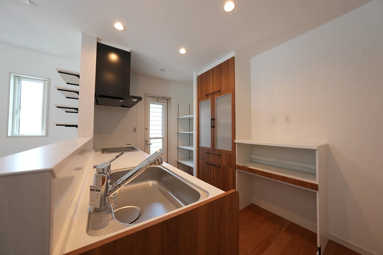 収納スペースを多く設けることで、雑然となりがちなキッチンもすっきり片づけることが可能に。