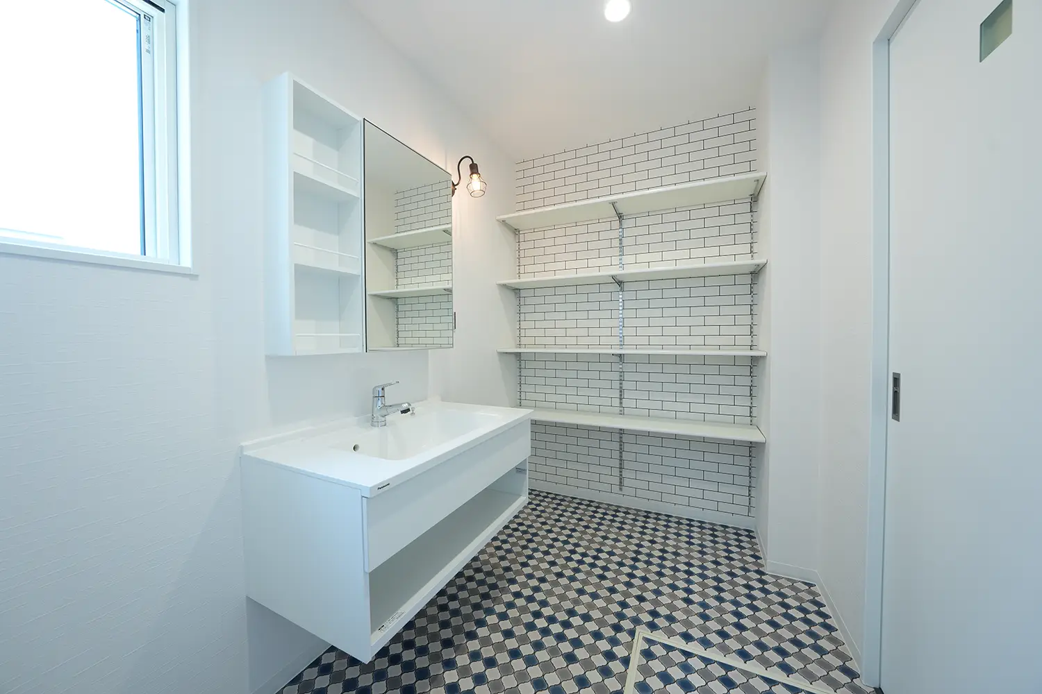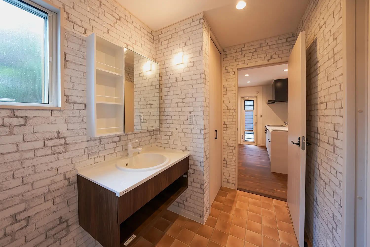 洗面周りも白いレンガ調のデザインにすることで明るく清潔感のある印象に。