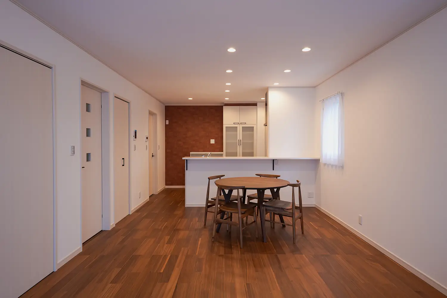 ダークブラウンでまとめた床と建具がシックで落ち着いた印象のLDK。
