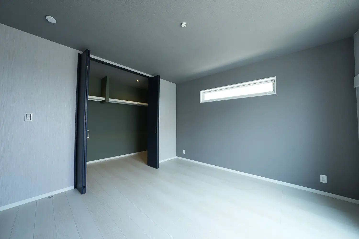 落ち着きのあるモノトーンの寝室はご夫婦のくつろぎ空間として。